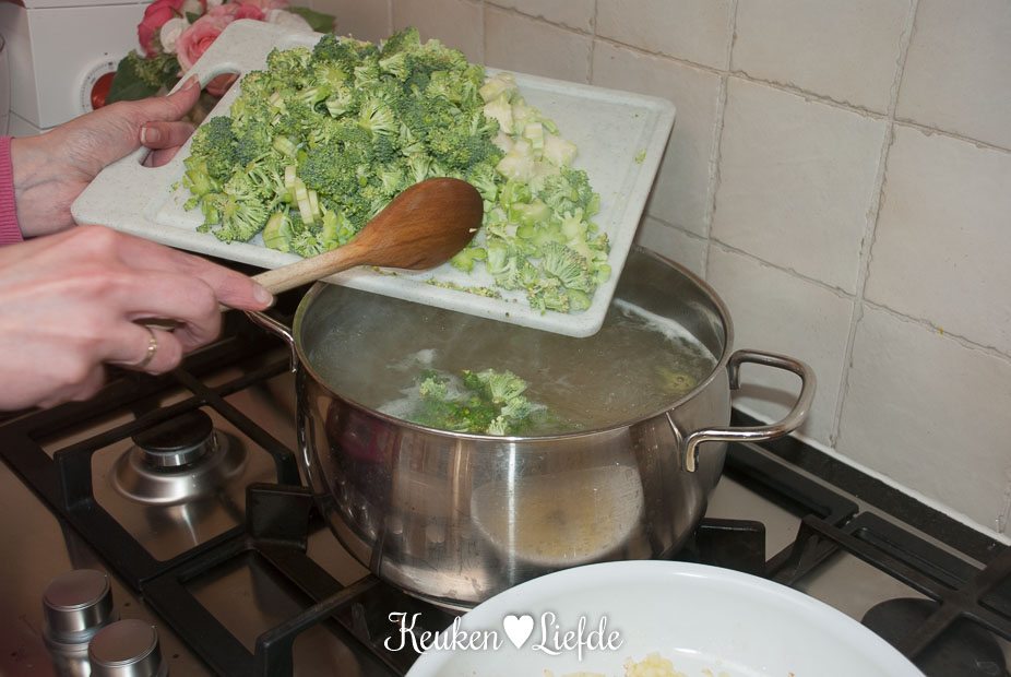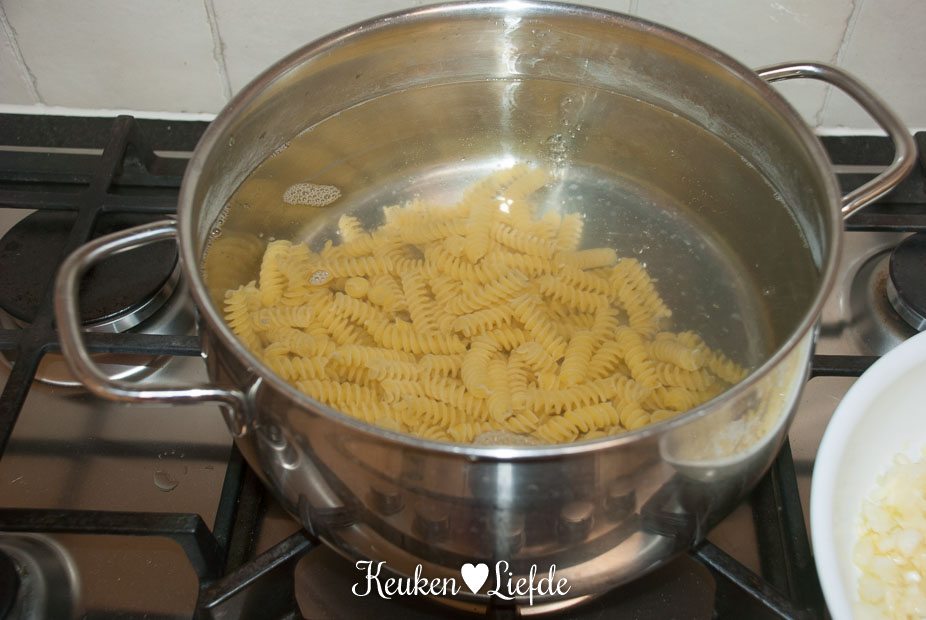 Breng een grote pan met water aan de kook en kook de fusilli beetgaar volgens de omschrijving op het pak. Snijd de broccoli in kleine roosjes, schil de stronk en snijd in plakjes. Voeg de laatste 4 minuten van de kooktijd de broccoli toe. Giet de pasta en broccoli af, vang een scheutje van het kookvocht op, en laat in een zeef of vergiet goed uitlekken. Doe de pasta en broccoli terug in de kookpan en roer om met wat olijfolie.