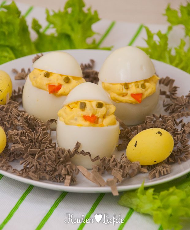 Tijdens de paasdagen schuif ik het liefst aan voor een uitgebreide brunch, of een gezellige borrel met feestelijke hapjes. Deze gevulde paaseieren mogen natuurlijk niet ontbreken. Ella-Marie vindt ze geweldig omdat het lijkt alsof er uit de eieren kuikentjes komen – maar ze maken papa en mama ook erg blij!