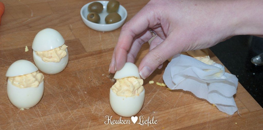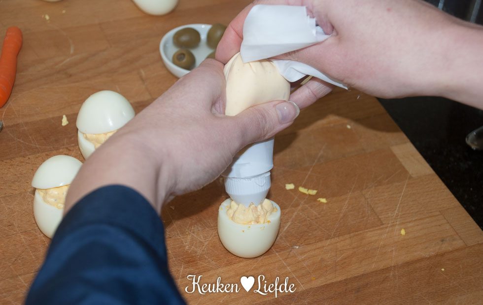 Vul het uitgeholde ei met de vulling (dit gaat makkelijk met een spuitzak) en zet het kapje er voorzichtig bovenop.