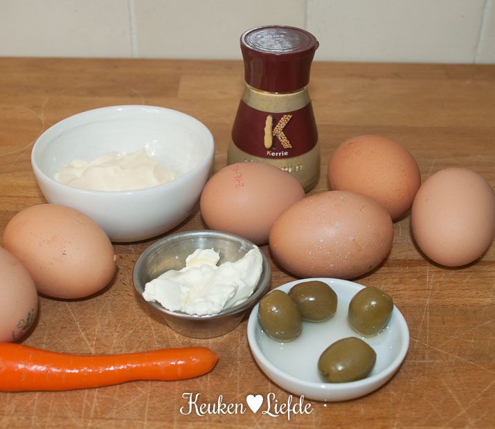 Snijd aan de bovenkant circa 1/3 van het ei af (het kapje) en snijd een klein stukje van de onderkant af, zodat het ei makkelijk rechtop blijft staan. Hol het ei voorzichtig uit. Prak het eigeel fijn en meng met de mayonaise, crème fraîche, kerriepoeder en breng op smaak met zout en peper.