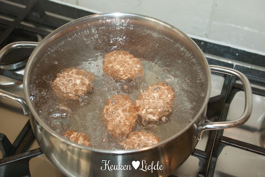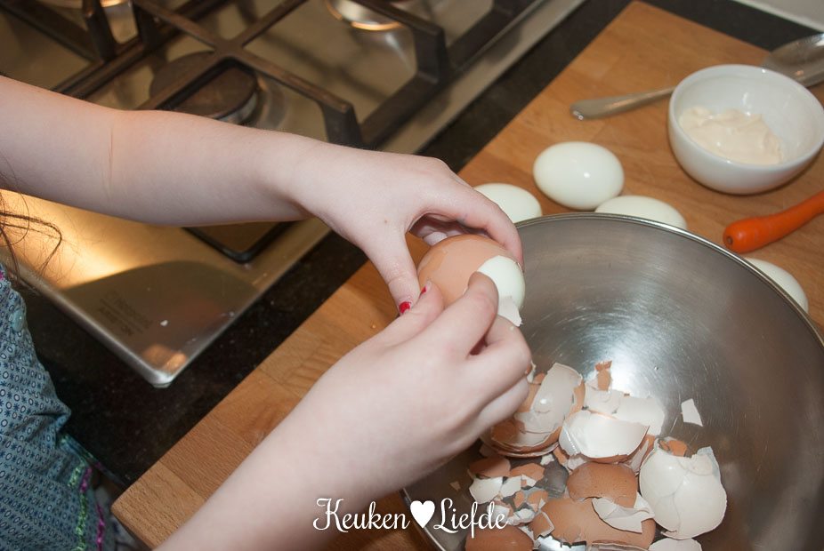 Prik gaatjes in de eieren en kook ze in kokend water in circa 8 minuten hard. Spoel ze af met koud water en pel ze.