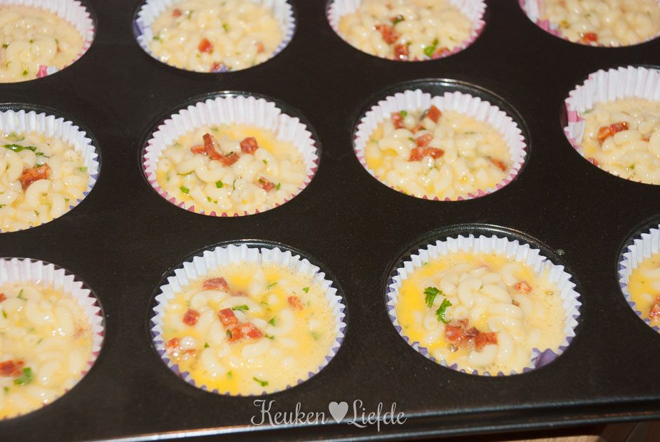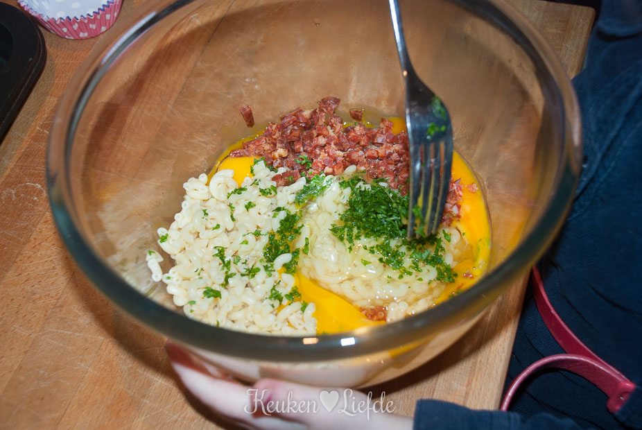 Meng in een kom de eieren, macaroni, chorizo en peterselie en breng licht op smaak met zout en peper (pas op met het zout, want de chorizo is ook zout). Roer door elkaar en verdeel dit mengsel over de papieren vormpjes. Bak circa 15 tot 20 minuten in de oven, of totdat het ei gestold is.