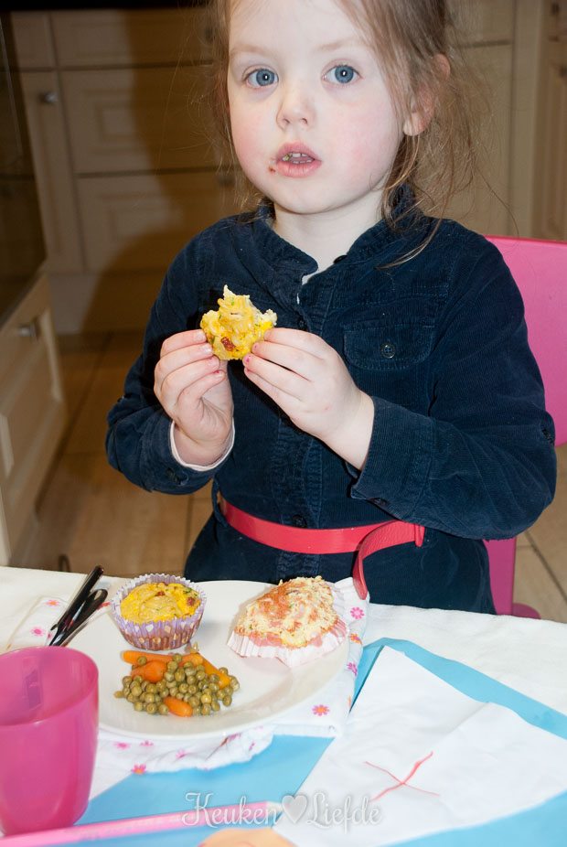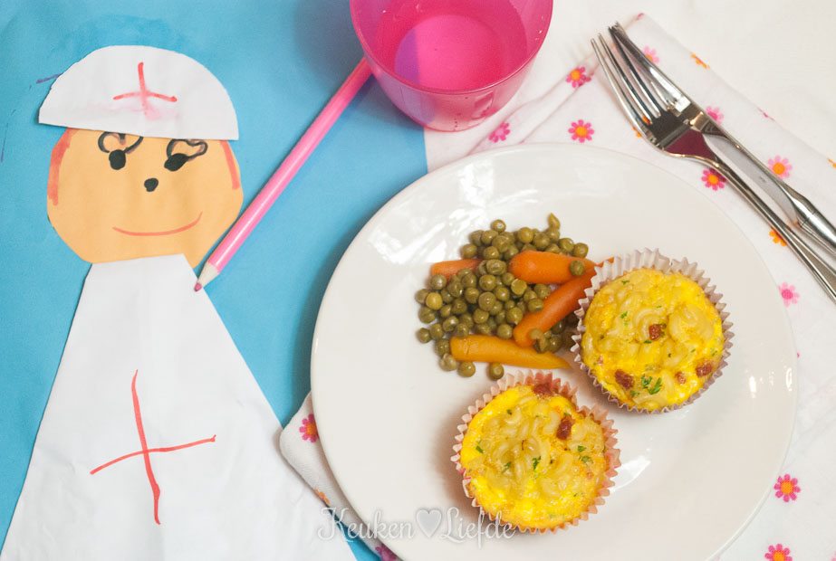 Dit is een ontzettend makkelijk en leuk kinderrecept dat tevens ideaal is om etensrestjes uit de koelkast mee op te maken. Restjes tomatensaus, een verdwaald stukje paprika of prei, een geopend blikje mais: je mag het allemaal gebruiken voor deze feestelijke macaroni-frittata’s. Ze worden er alleen maar kleurrijker en smakelijker van! Omdat ik geen restjes groenten meer in de koelkast had liggen, trok ik een blikje wortels en doperwten open om ernaast te serveren, maar je kunt ze natuurlijk ook gewoon in de frittata stoppen. Overgebleven frittata’s kun je de volgende dag koud in de broodtrommel stoppen of even opnieuw in de oven opwarmen. In de zomer gaan ze mee in de picknickmand. Heerlijk!