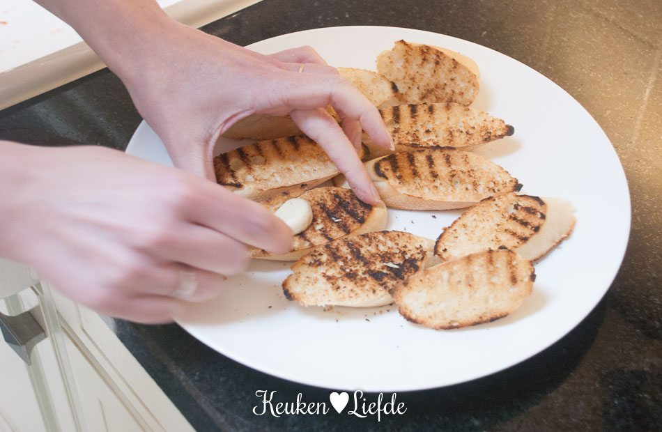 Pel de knoflook en halveer het teentje. Wrijf het warme brood in met de opengesneden kant van de knoflookteen en druppel daarna wat olijfolie over het brood.