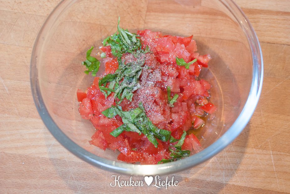 Beleg de bruschetta met het tomatenmengsel en garneer eventueel met een klein blaadje basilicum. Serveer direct.