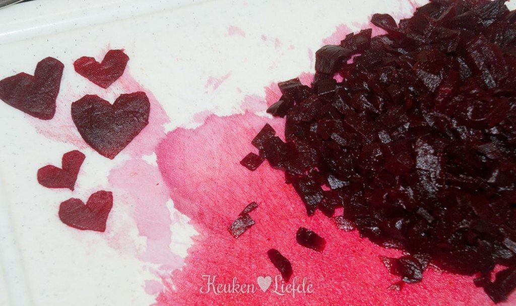 *Rode biet met schil losjes in aluminiumfolie wikkelen en in een voorverwarmde oven van 180 graden in circa 60 minuten gaar poffen.