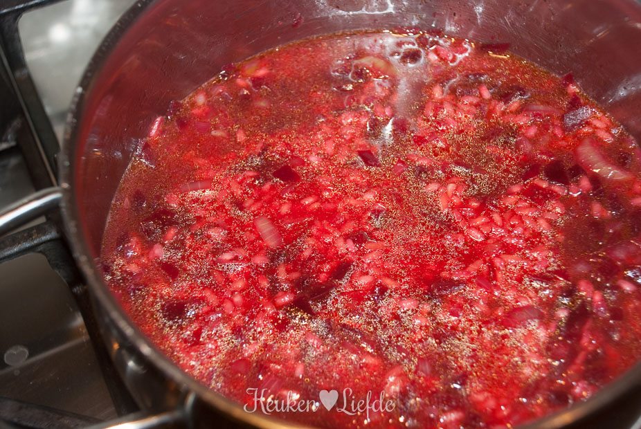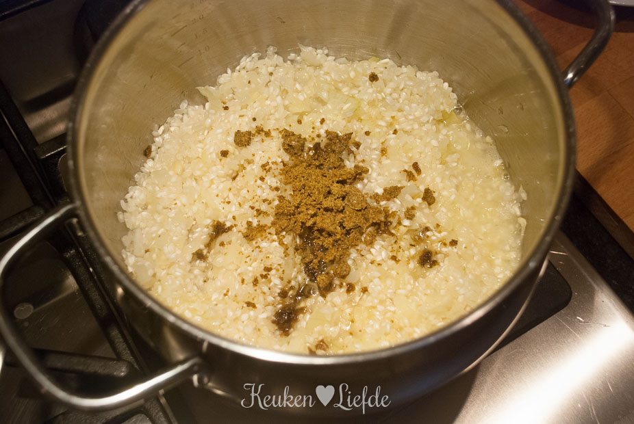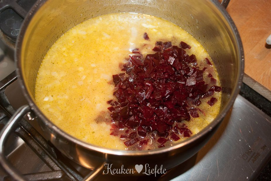 Verkruimel de bouillontabletten over de risotto en voeg zoveel water toe totdat de risotto net onder staat. Roer even door, voeg de bietjes toe (mijn bietjes waren nog vrij hard, dus voegde ik ze al direct toe om verder te laten garen) en laat op laag vuur zachtjes pruttelen. Voeg steeds opnieuw wat water toe als het vorige bijna is opgenomen (de risotto mag niet te droog worden!).