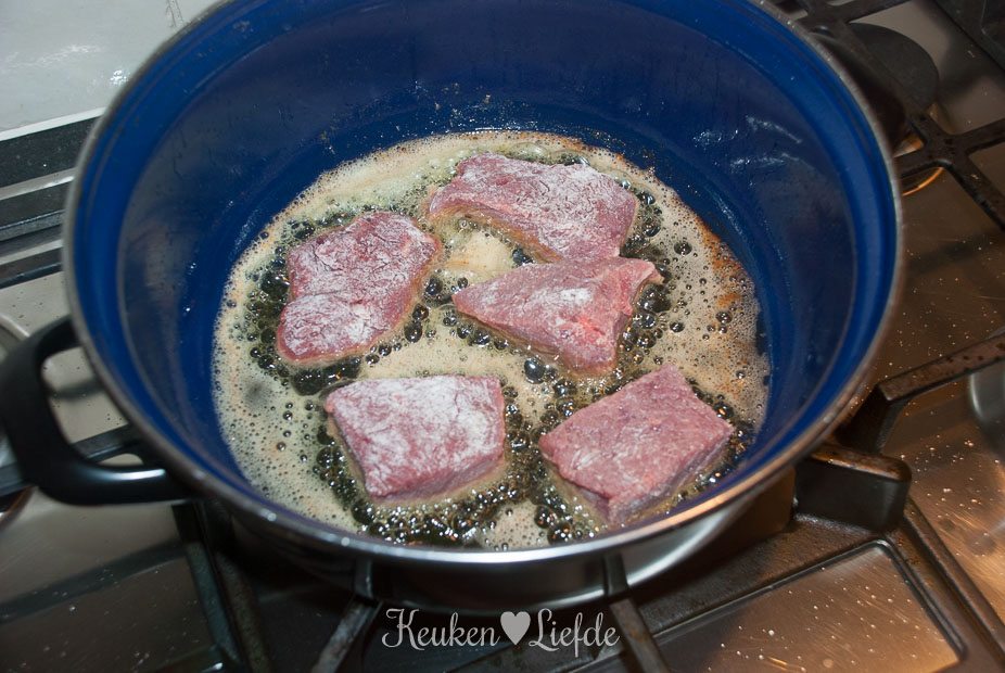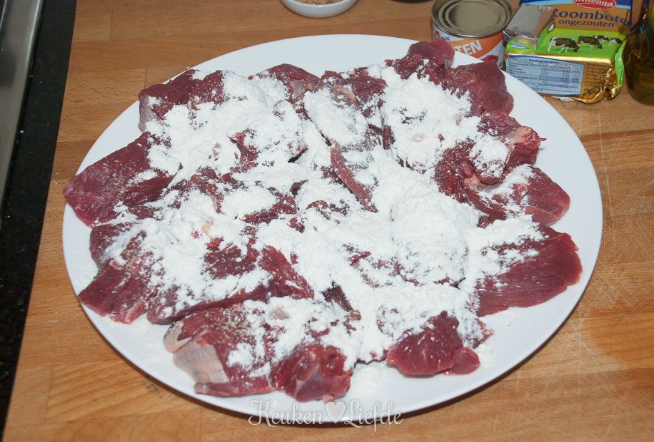 Bestrooi het vlees met zout en peper en bestrooi met de bloem. Hussel even om, zodat alle kanten met bloem bedekt zijn. Verhit de braadpan met een flinke scheut olijfolie en een klont roomboter en wacht totdat de belletjes bijna zijn verdwenen. Bak het vlees (schud overtollig bloem van het vlees af, voordat je het aan de pan toevoegt) op middelhoog vuur kort aan beide kanten goudbruin (doe dit in kleine porties tegelijk, anders daalt de temperatuur van het vet te snel en gaat het vlees stoven in plaats van bakken). Schep het vlees uit de pan en leg op een bord.