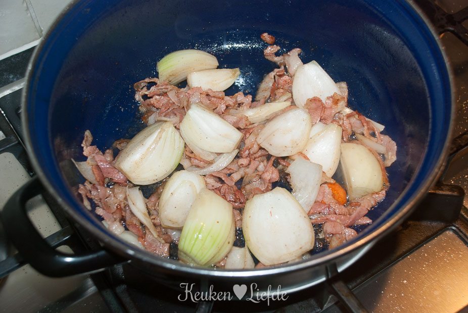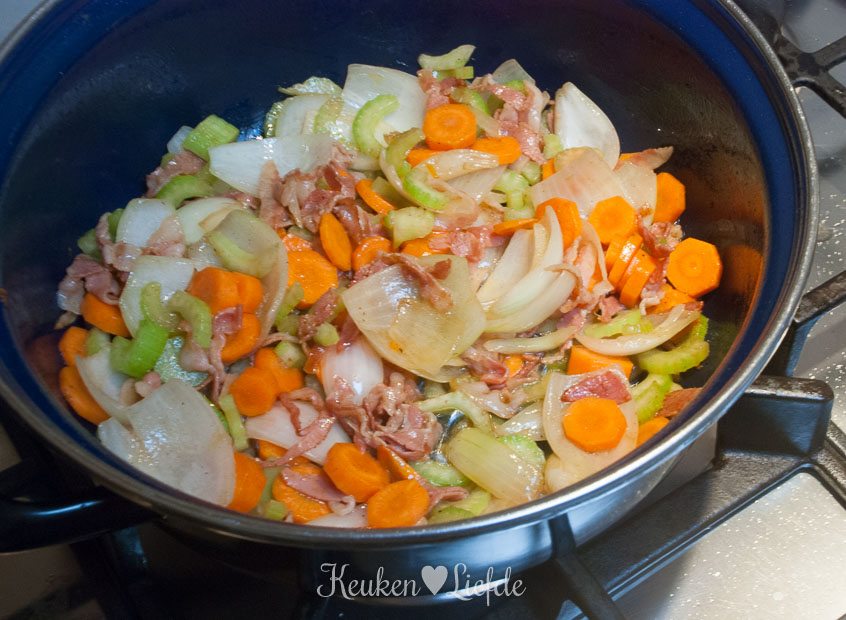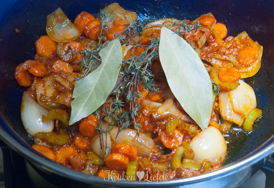 Bak in het braadvet van het vlees het spek en de uien, totdat de uien wat zachter zijn en het spek begint te kleuren. Voeg indien nodig nog een extra klontje roomboter of olijfolie toe en doe de bleekselderij, wortel en knoflook erbij. Bak even verder totdat de wortel en bleekselderij iets zachter zijn en voeg dan de tomatenpuree en suiker toe. Roer goed door en bak kort mee. Voeg de tijm en laurier toe. Leg het vlees bovenop de groenten en giet de vrijgekomen vleessappen erbij. Giet er zoveel wijn bij, totdat het vlees nét onderstaat en verkruimel de bouillontablet erover (schenk de wijn langs de zijkant in de pan om te voorkomen dat het vlees ‘schrikt’ en taai wordt, of verwarm de wijn voordat je hem toevoegt).