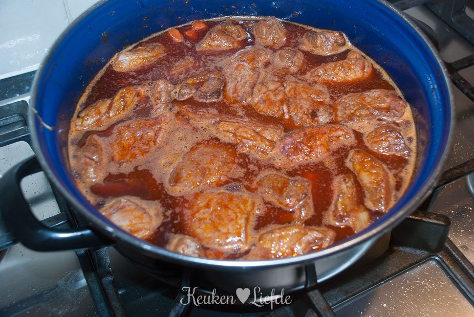 Zet de braadpan op het allerlaagste pitje, het vocht mag niet koken, maar alleen heel zachtjes pruttelen. (ik zet altijd nog extra een sudderplaatje op het gaspitje, omdat het anders te hard gaat). Je kunt de pan (mits ovenbestendig) ook in een voorverwarmde oven zetten van circa 120 graden. Controleer af en toe of het vocht niet te hard bubbelt, zet anders de temperatuur lager. Doe de deksel op de pan en stoof het vlees in circa 2,5 uur (maar het kan ook veel langer duren) gaar. Het vlees moet uit elkaar vallen als je er met een vork op drukt.