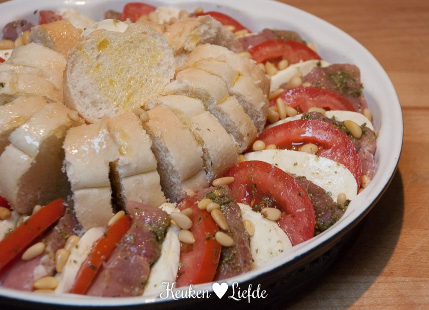 Verwarm de oven voor op 200 graden. Vet de ovenschaal in met wat olie. Snijd de varkenshaas in circa 14 plakken en doe hetzelfde met de mozzarella en tomaten. Bestrooi de varkenshaas met zout en peper en besmeer de snijkanten van de varkenshaas met pesto. Leg de varkenshaas, tomaat en mozzarella dakpansgewijs in de ovenschaal. Leg het stokbrood in een ronde ring in het midden, of bak het stokbrood in een aparte schaal.