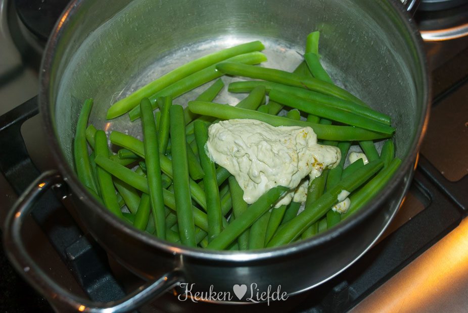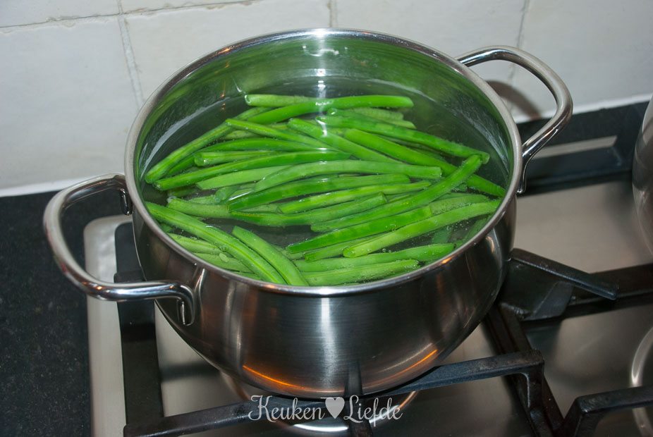 Kook ondertussen de sperziebonen beetgaar, giet ze af en hussel ze om met de rest van de pestocrème.