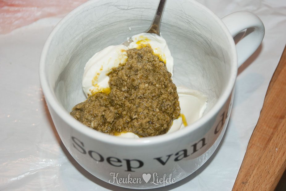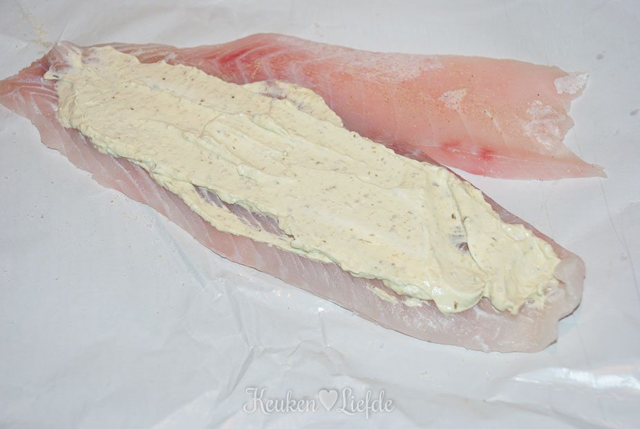 Roer de pesto door de crème fraîche en bestrijk één zijde van de vis royaal met pestocrème (houd 1 eetlepel achter). Gebruik je losse moten vis? Kerf de bovenkant lichtjes in met een scherp mes en wrijf de pestocrème erin. Vouw de vis dicht en omwikkel met Prosciutto.