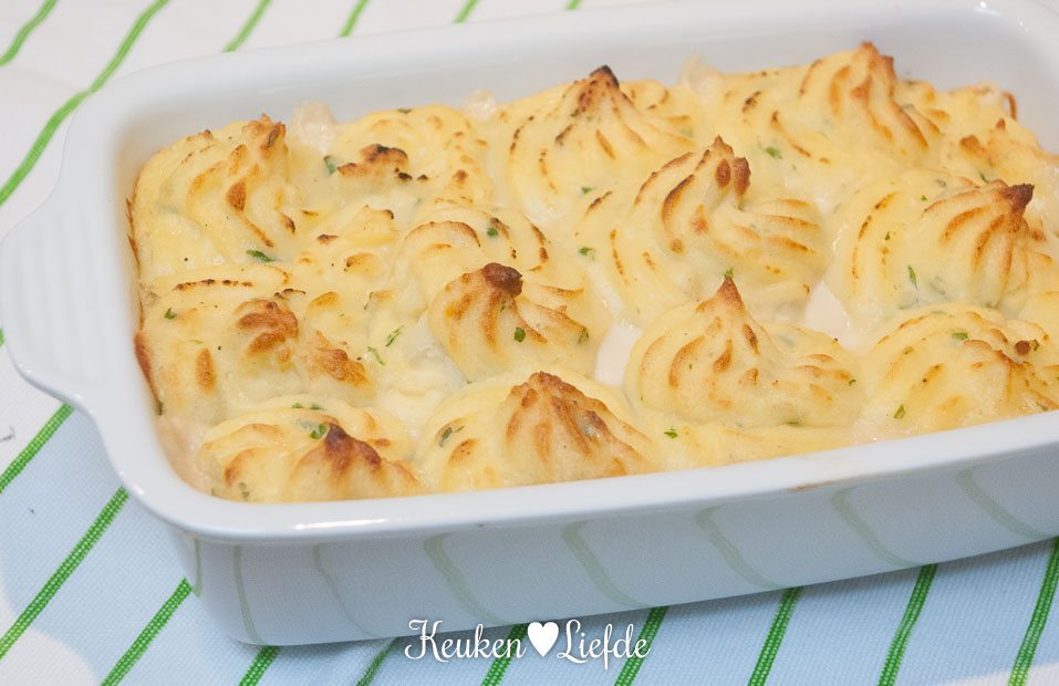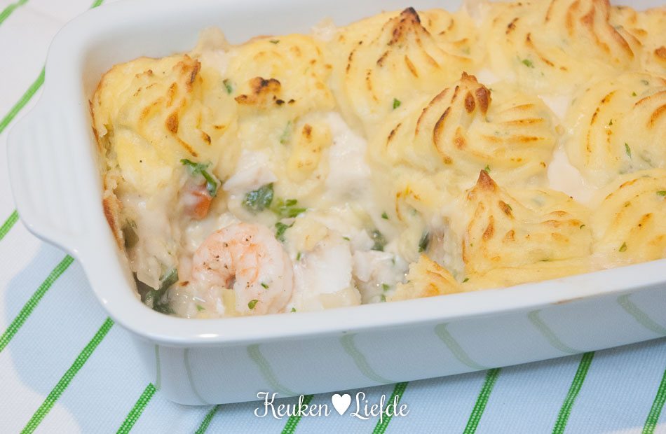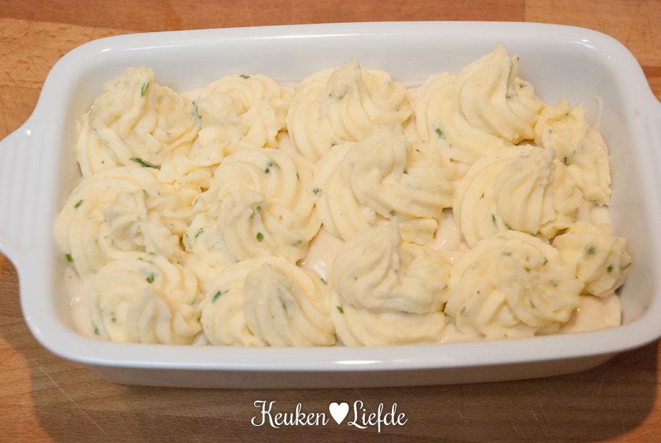 Toch kon ik het niet laten om mijn kookhandjes te laten wapperen. Ik wilde de kabeljauws eer aan doen en verwerkte ze daarom samen met wat garnalen in een smakelijke ovenschotel, afgetopt met fluweelzachte aardappelpureetorentjes. Smullen, smullen, smullen!
