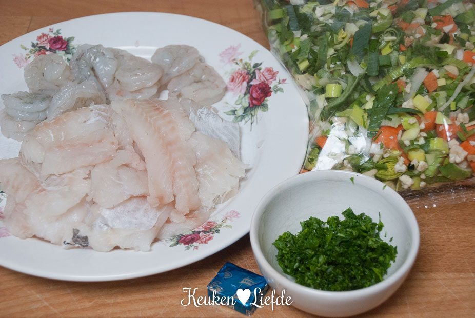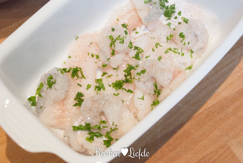 Verdeel de kabeljauw en garnalen in een ovenschaal en bestrooi met wat peterselie, peper en zout. Verdeel dan de groenten erover.