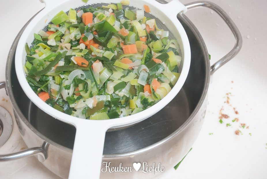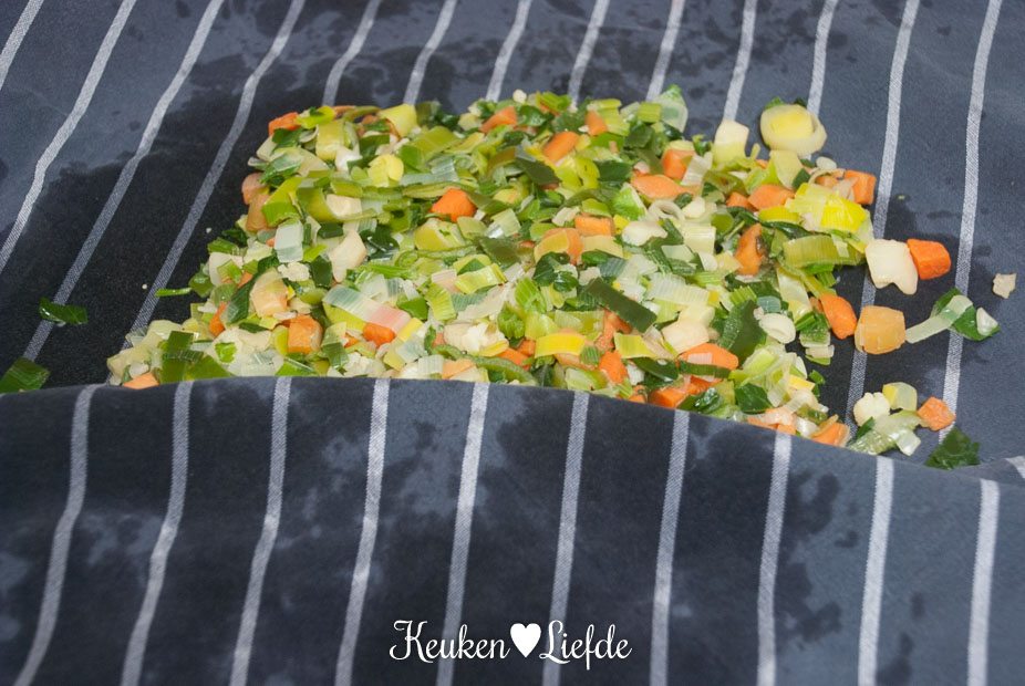 Breng in een pan een halve liter water met de bouillontablet aan de kook. Voeg de groenten toe aan de bouillon en zet het vuur lager. Kook de groenten in circa 5 minuten zacht. Giet de groenten af in een zeef en laat uitlekken, vang 300 ml van de bouillon op. Dep de groenten goed droog op een theedoek.