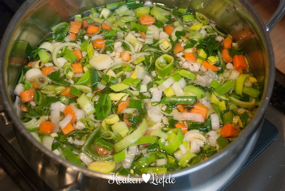 - 500 g gesneden soepgroenten (prei, bloemkool, wortel, selderij)