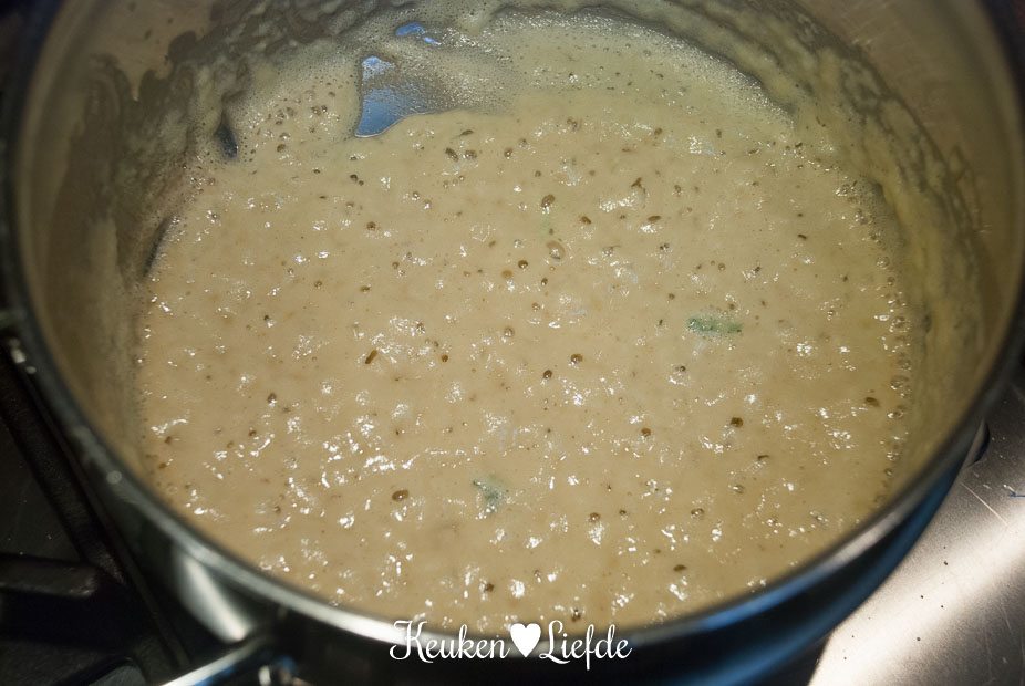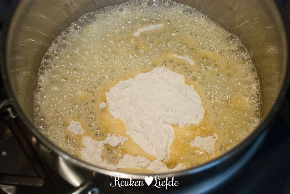 Smelt de boter voor de saus in een pannetje en voeg de bloem toe. Roer goed door en laat de bloem enkele minuten op laag vuur meegaren.