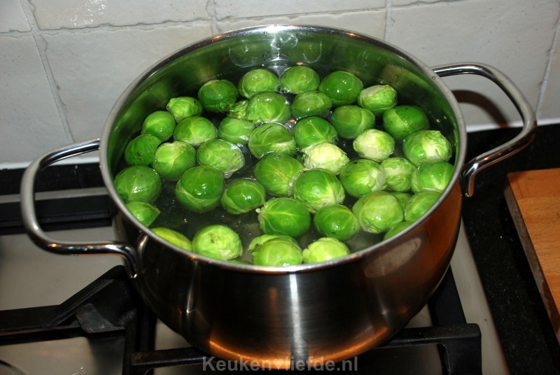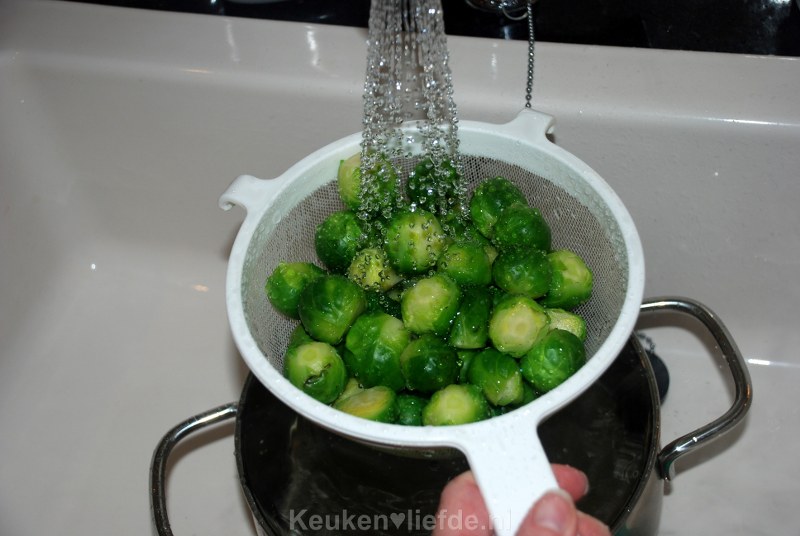 Breng een ruime pan met water en wat zout aan de kook. Was de spruitjes en verwijder de harde wortelaanzet aan de onderkant. Kook de spruitjes een minuut in kokend water en spoel ze dan direct af met koud water.