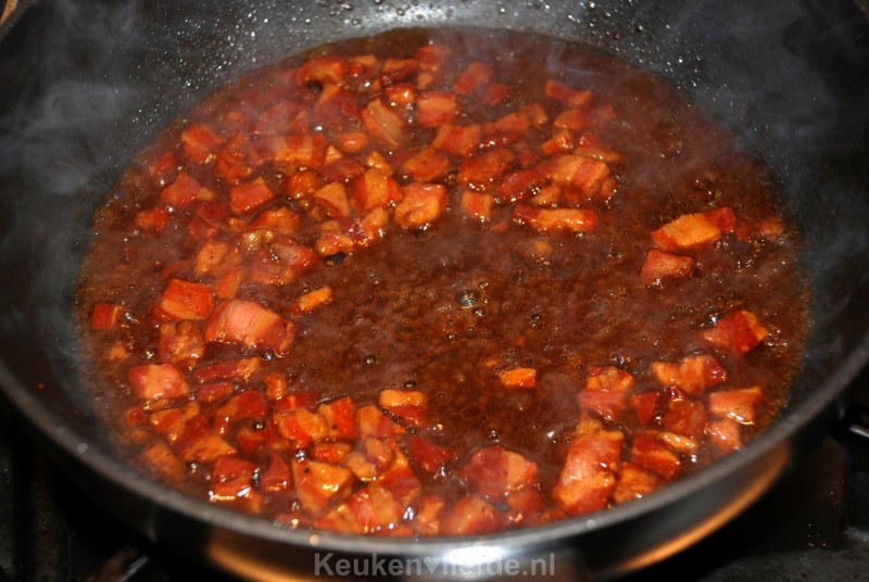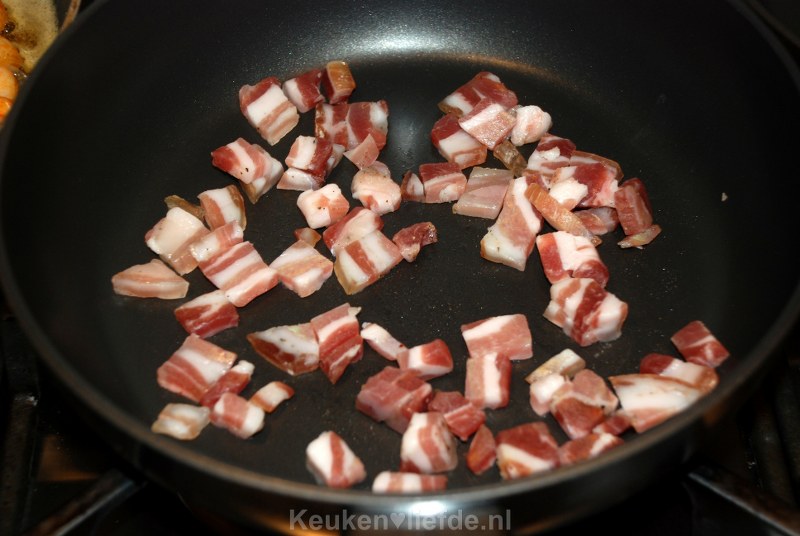 Laat ze goed uitlekken. Bak de pancetta in een koekenpan met anti-aanbaklaag langzaam uit, totdat het vet begint te smelten en ze goudbruin kleuren.