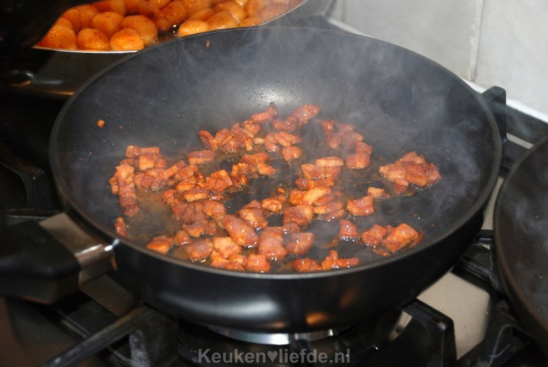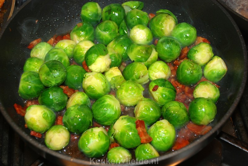 Voeg dan de spruitjes toe en bak mee totdat ze beetgaar zijn, en licht beginnen te kleuren.