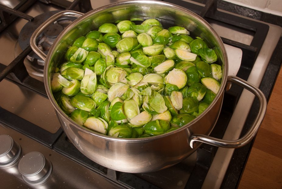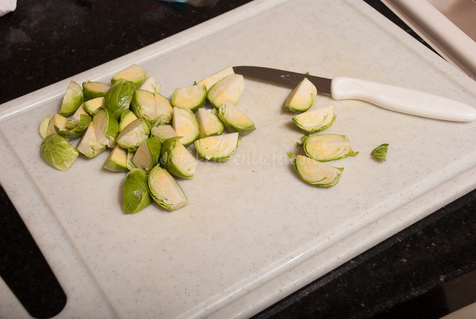 Was de spruiten. Snijd de aanzet van de spruitjes en snijd ze in vieren (ik had hele grote spruiten, middelgrote spruitjes kun je halveren en hele kleine spruitjes kun je heel laten).