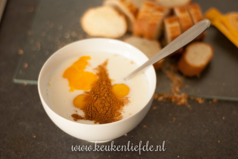 Roer de eieren, suiker, kaneel en melk in een kom door elkaar. Snijd het stokbrood in plakken en wentel ze door het eimengsel.