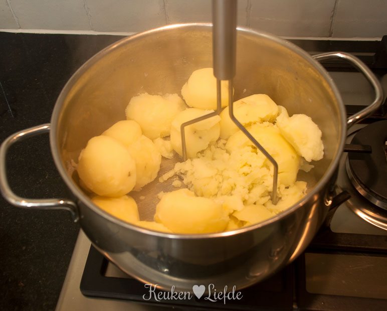 Kook ondertussen de aardappels gaar en giet ze af. Stamp ze fijn en roer de puree glad met wat melk en een klont roomboter.
