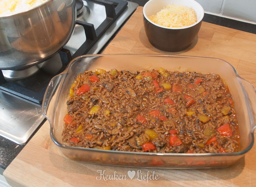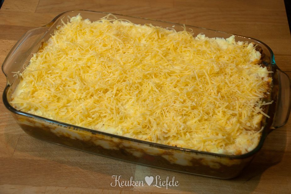 Verwarm de oven voor op 200 graden. Vet de ovenschaal in. Verdeel het gehaktmengsel over de ovenschaal en dek af met de aardappelpuree. Bestrooi met de geraspte kaas.