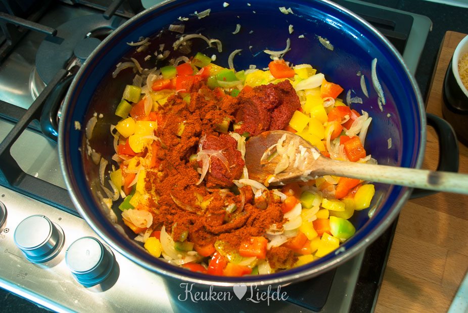 Verhit een grote koekenpan of braadpan met wat olie en bak de ui, knoflook, paprika’s en champignons op middelhoog vuur, totdat ze zacht zijn. Voeg de paprikapoeder en tomatenpuree toe en bak even mee.