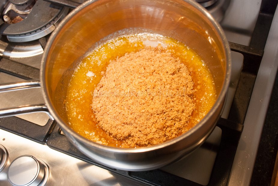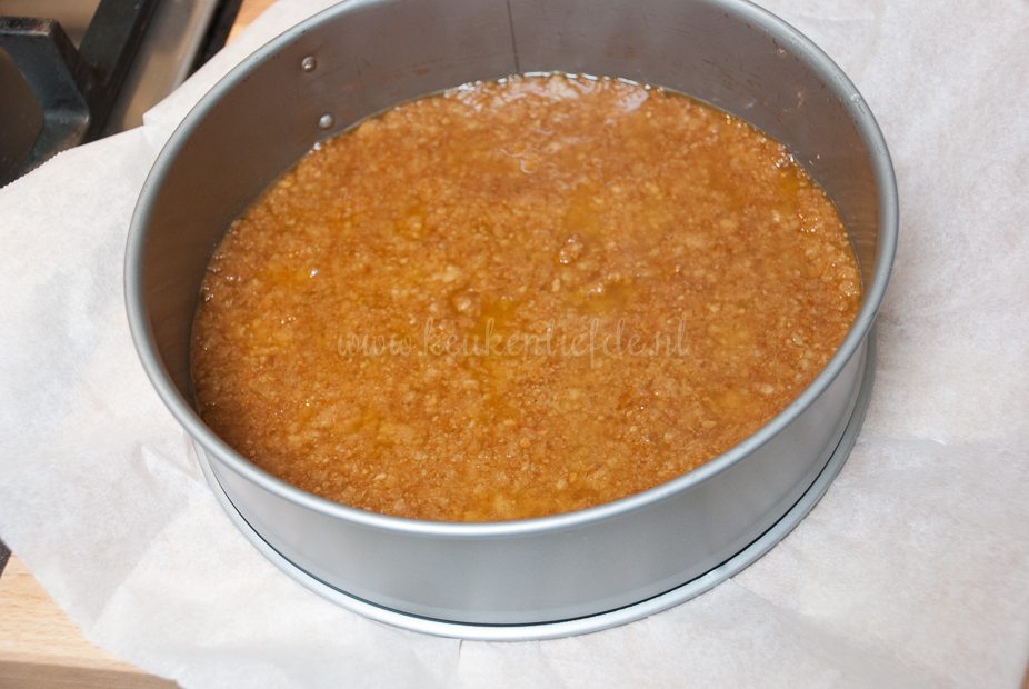 Smelt de boter in een steelpan. Maal de grote stroopwafels fijn (niet te fijn, je mag nog wat kleine stukjes zien) in de keukenmachine. Roer het stroopwafelkruim door de gesmolten boter en bedek hiermee de bodem van de springvorm. Druk lichtjes aan met de bolle kant van een lepel en zet in de koelkast.