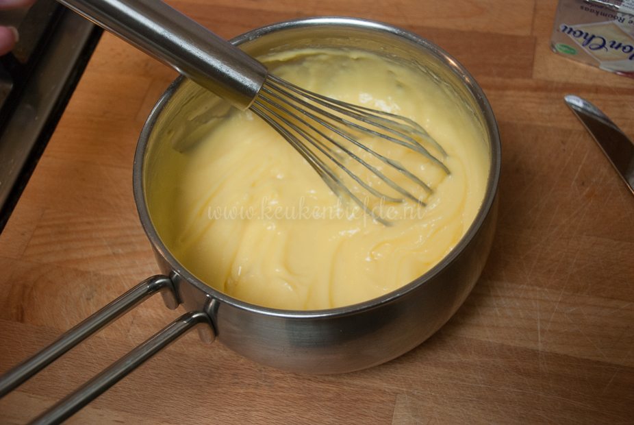 Bereid de banketbakkersroom en laat een nacht afgedekt in de koelkast staan om op te stijven. Indien je mix gebruikt voor banketbakkersroom kun je de banketbakkersroom gewoon op de dag zelf maken.