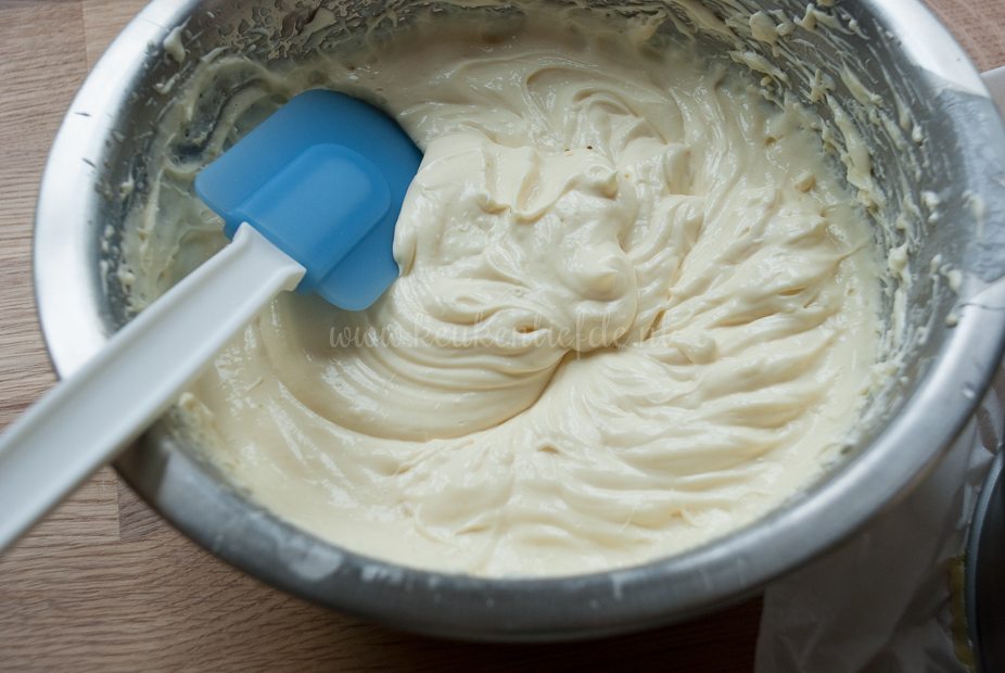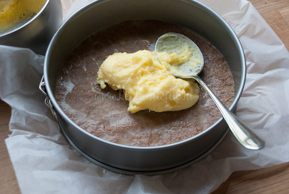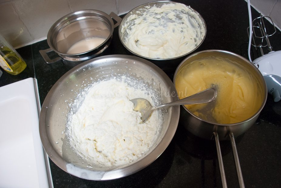 Zodra de warme gelatine in aanraking komt met het koude monchoumengsel wil het gaan stollen. Om klontjes te voorkomen is het dus belangrijk dat je direct goed mixt (gebruik een elektrische handmixer) als je de gelatine toevoegt en dit mengsel snel over de taartbodem verdeelt.