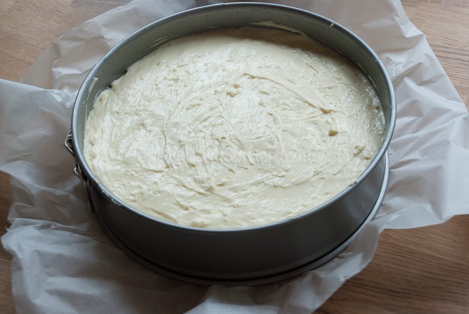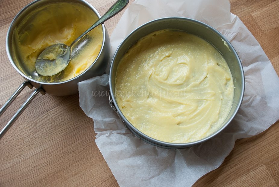 Verdeel de roomvulling over de taartbodem en strijk glad. Laat 4 uur opstijven in de koelkast.