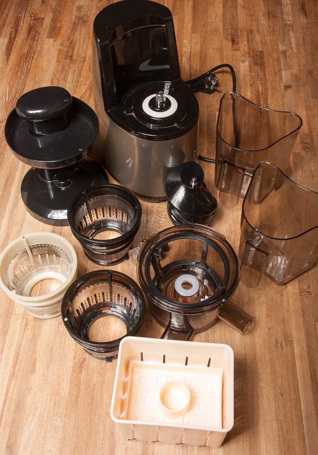 Oké, genoeg gekletst. Tijd voor een sapje! Wat mij het eerste opvalt is de compactheid van de SuperJuicer; hij is drie keer zo klein als mijn sapcentrifuge! Wel moet ik even slikken als ik alle onderdelen uitgestald op tafel zie staan …