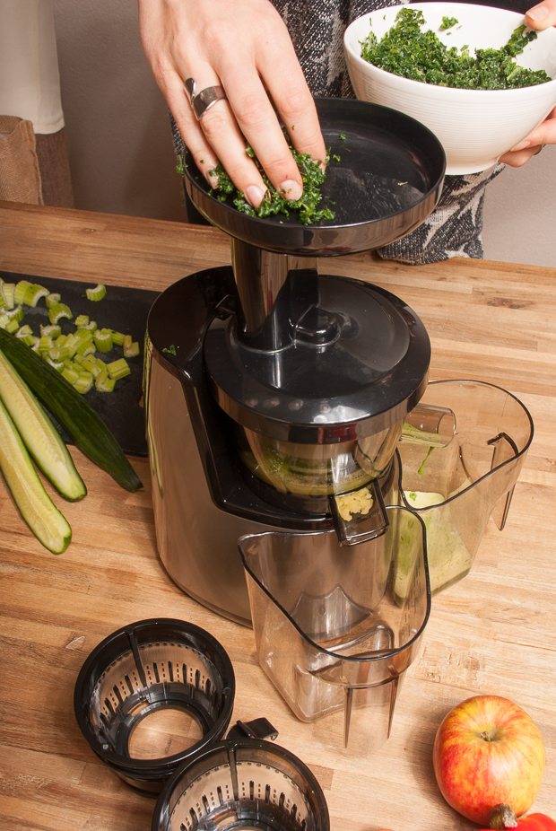 Snijd de bleekselderij in stukken (de schil van bleekselderij bestaat uit stugge draden die moeilijk zijn af te breken). Stop alle ingrediënten door de vulopening en pers ze uit.