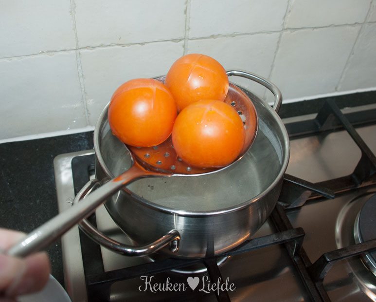 Kerf de tomaten aan de bovenkant kruislings in met een mesje en dompel ze circa 20 seconden onder in kokend water. Schep ze uit het water en trek het vel eraf. Knijp de tomaten boven de spoelbak uit om de zaadjes kwijt te raken en snijd ze daarna in stukken.