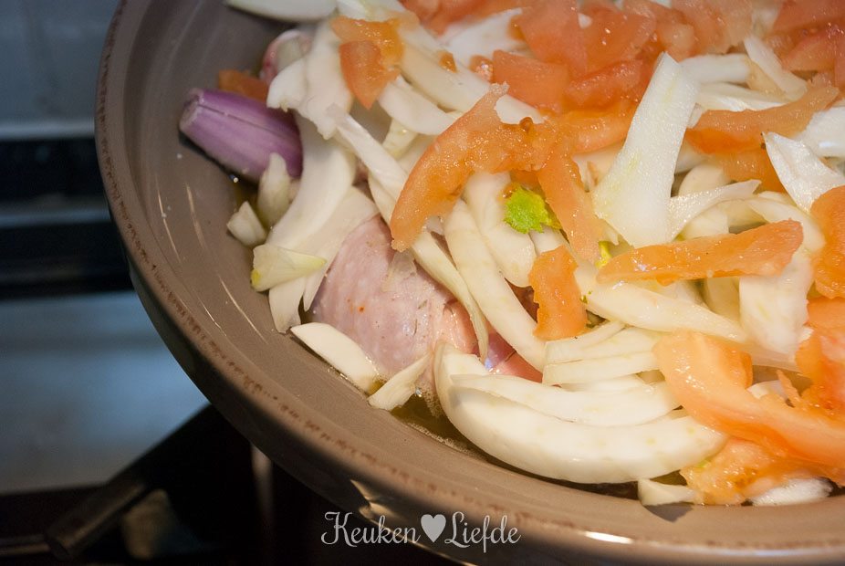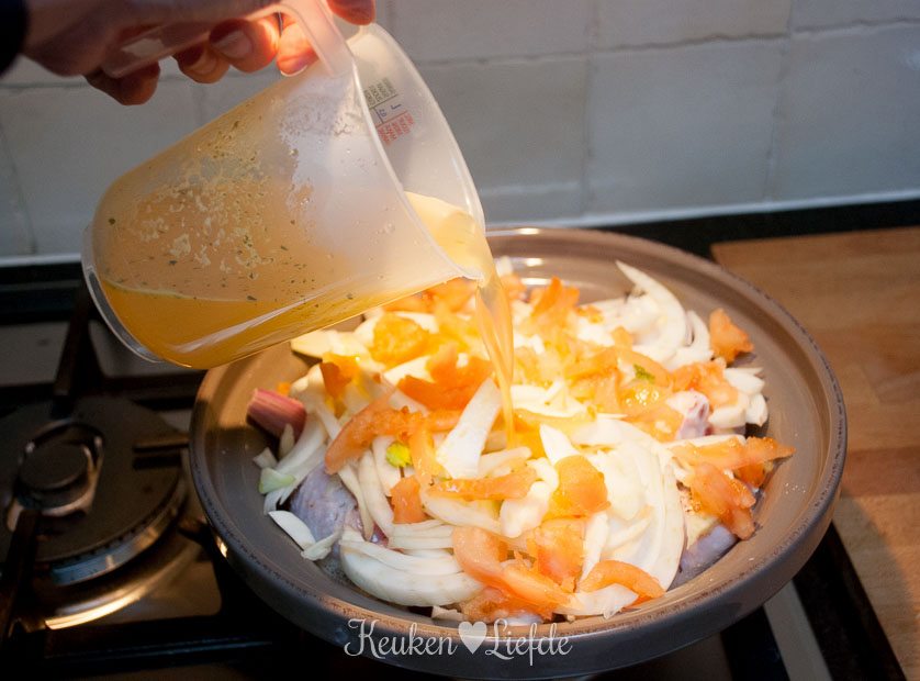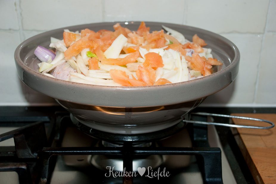 Voorweken is bij mijn tajine niet nodig, maar voor de zekerheid plaatste ik toch het boven- en ondergedeelte een nacht in water. Ik bereidde deze tajine met kip en venkel op een vlamverdeler op de gaskookplaat, wat bijzonder succesvol uitpakte. Toch had ik enorm veel geluk, want de fabrikant had een verkeerde gebruiksaanwijzing bijgesloten – mijn tajine mag uitsluitend in de oven! Wellicht zijn het voorweken en de vlamverdeler mijn redding geweest, maar de volgende keer gaat dit gerecht dus mooi de oven in. De kip (en indien gewenst ook de sjalotten) moet dan wel eerst in een andere pan aanbraden; daarna kan het de tajine in voor verdere ovenbereiding.