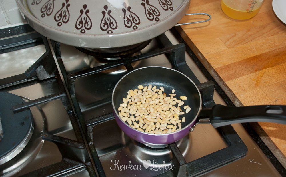 Rooster de pijnboompitten in een droge koekenpan licht goudbruin en voeg ze het laatste half uur van de bereidingstijd samen met de olijven en uitgelekte rozijnen toe aan de kip.