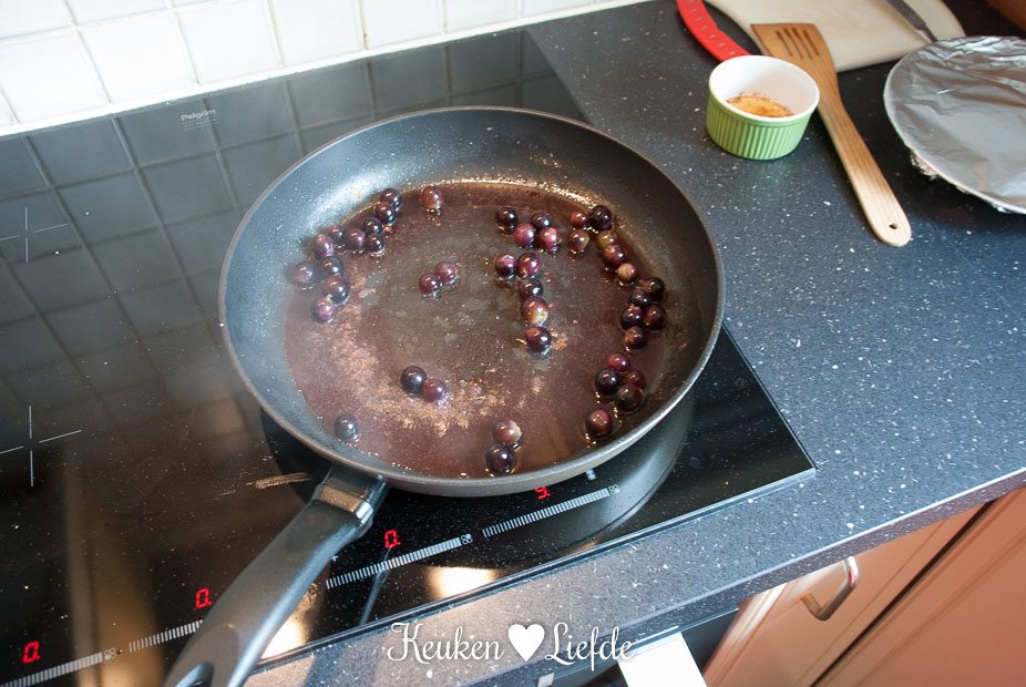 Schenk de helft de het bakvet uit de koekenpan (je hebt dit verder niet meer nodig, maar je kunt het bewaren om bijvoorbeeld aardappels in te bakken) en voeg de port en de helft van de druiven toe. Laat op middelhoog vuur even koken, totdat de druiven openbarsten. Voeg indien nodig een scheut water toe als je te weinig vocht hebt. Plet de druiven met een vork en haal de saus door een fijne zeef. Doe weer terug in de pan en voeg de overige druiven toe, warm nog kort even door.