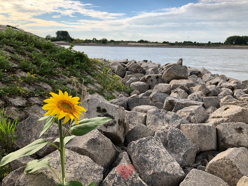 We wonen vlakbij de Waal en op zondag gaan we vaak wandelen in de uiterwaarden. Tussen de rotsblokken langs de Waal groeide deze prachtige zonnebloem maar ook cherrytomaatjes kwamen we tegen. Ook konden we vandaag de eerste walnoten rapen van onze walnotenboom.
