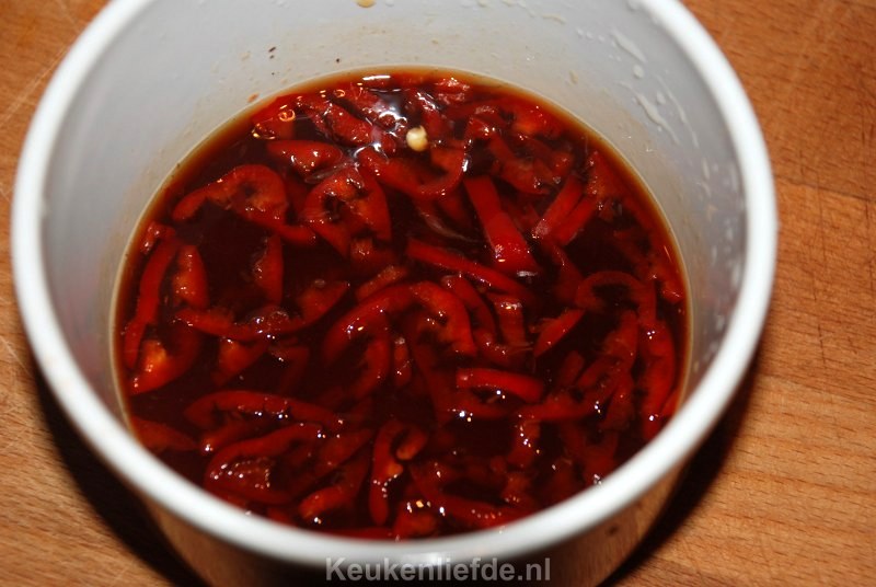 2 (niet al te grote) rode pepers, schoongemaakt en in smalle ringen gesneden