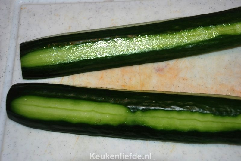 Kook de peultjes of sugar snaps 2 minuten in kokend water. Ze moeten nog ‘bite’ hebben! Giet ze af in een zeef en spoel af met koud water. Schil de komkommer half om half met een dunschiller, snijd overlangs en verwijder de zaadlijst met een lepel.