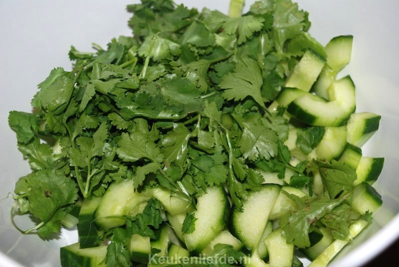 Meng de komkommer, peultjes en koriander in een schaal (de volgende keer dat ik dit gerecht weer maak, voeg ik wat minder koriander toe. De smaak is namelijk nogal overheersend).