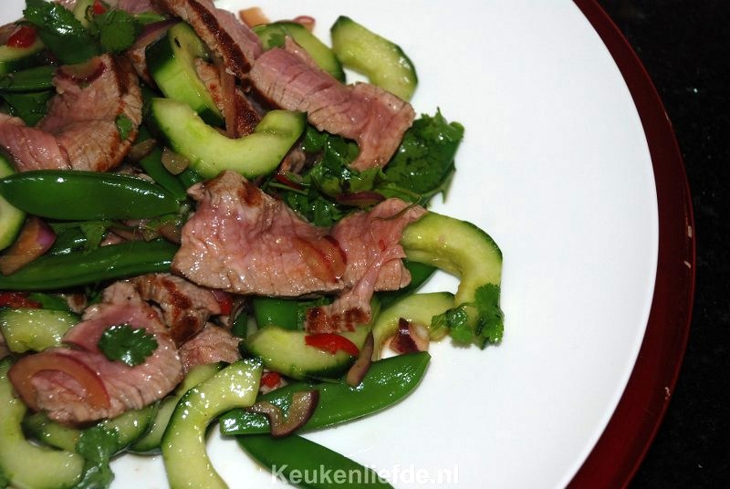 Deze Thaise biefstuksalade met knapperige zoete sugar snaps en malse ossenhaas is puur genieten! Bovendien is deze salade supergezond en lekker licht waardoor hij prima past in een balansdag.