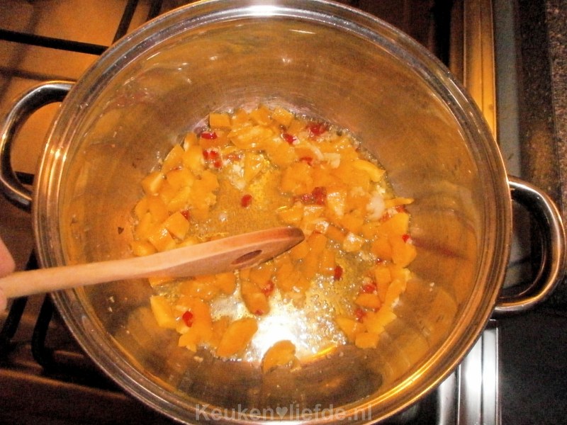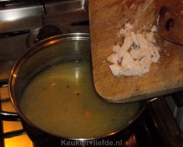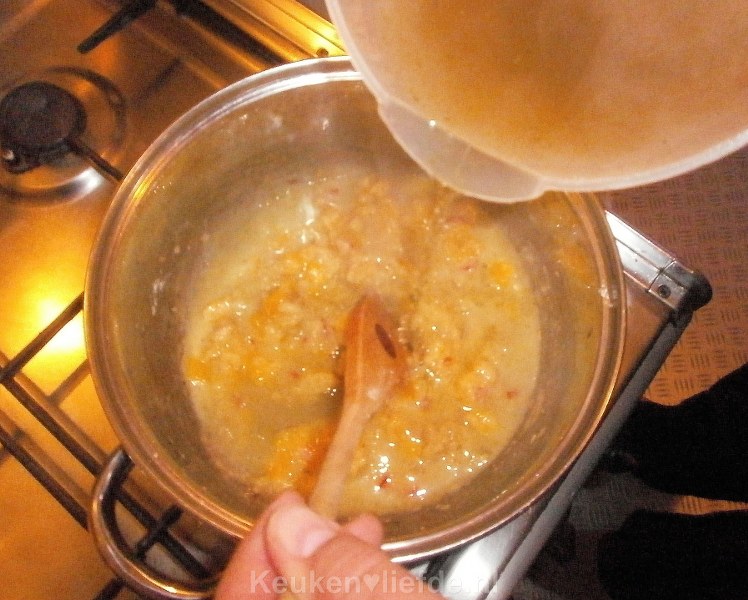Nu doe je beetje bij beetje de bouillon erbij zodat er een mooi gebonden soepje ontstaat.