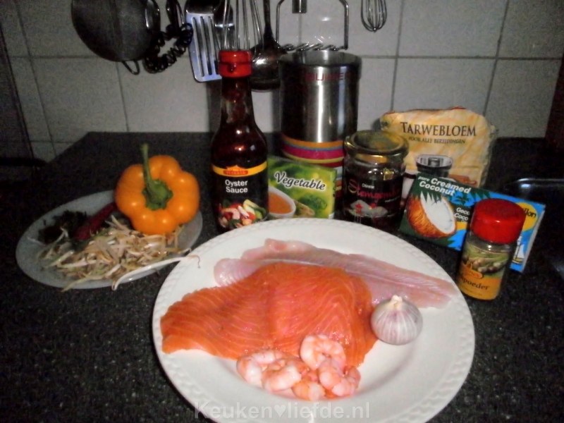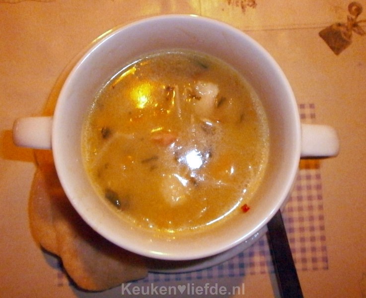Deze Thaise vissoep is ontstaan door het spelen van mijn twee dochters van 5 en 7 jaar. Zij speelden dat ze soep aan het koken waren. Niet de Thaise vissoep, maar een roomsoepje zoals zij het noemden. Met een pan en een pollepel van mij waren ze lekker aan het spelen en ik hoorde wat ze er allemaal in deden. Nou, dat klonk eigenlijk best lekker en ik heb het opgeschreven en ook echt gemaakt. Zij maakten zogenaamd bouillon met een bouillonblokje, knoflook en peper. Er ging een verse worst in en als groente een ui, twee wortels en een rode paprika. Als kruiden verse peterselie en bieslook en ze maakten er een roomsoepje van.