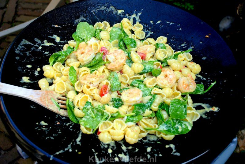 Deze pasta met garnalen in pesto-roomsaus van de scottelbraai is mijn favoriet.