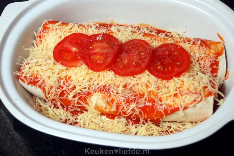 Verdeel de helft van de tomatenfritto en geraspte kaas over de bodem van de ovenschaal. Verdeel de spinazie-feta vulling over de twee tortilla’s en rol ze op.