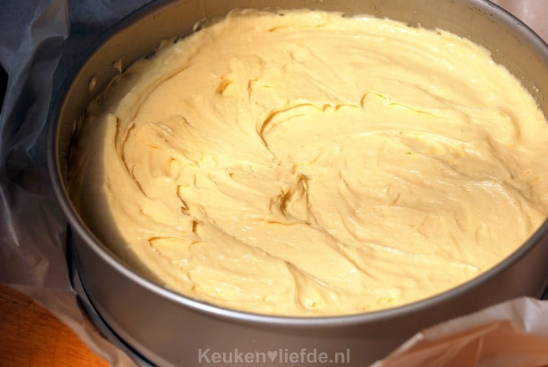Bak de taart 40-45 minuten in de oven, of totdat de cake goudbruin en gaar is. Haal de taart uit de oven en keer de taart ondersteboven op een taartschaal. Verwijder voorzichtig de taartvorm en het bakpapier.